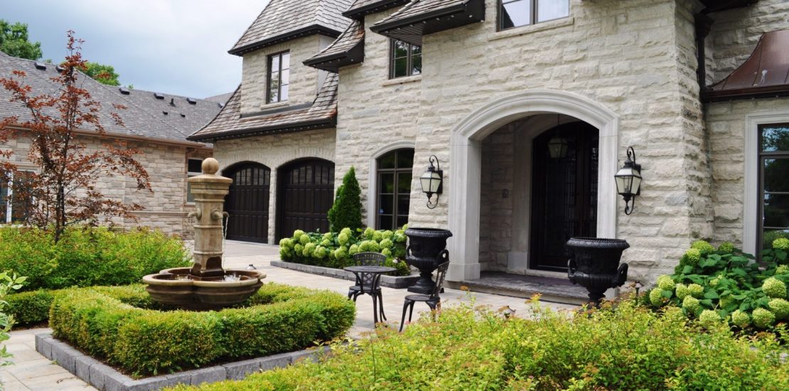 Classic Sophisticated Courtyard Entry. Oakville Creating a modern seating porch A beautiful sophisticated courtyard entryway greatly enhance this home’s curb appeal and provide a way for family and guests to get to the front door. By providing places to sit and enjoy the view on the classic gardens and the art sculpture of the fountain we encourage family, neighbours and guests engagement. Watching
