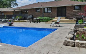 This rectangular contemporary pool design in Hamilton giving a sleek and clean feel. With the right surrounding pool elements, a geometric shaped pool will never go out of style. Smooth and clean concrete pool patio, warming colour and texture of the wood deck together with stone garden wall and modern furniture create a sophisticated contemporary look of the back yard.