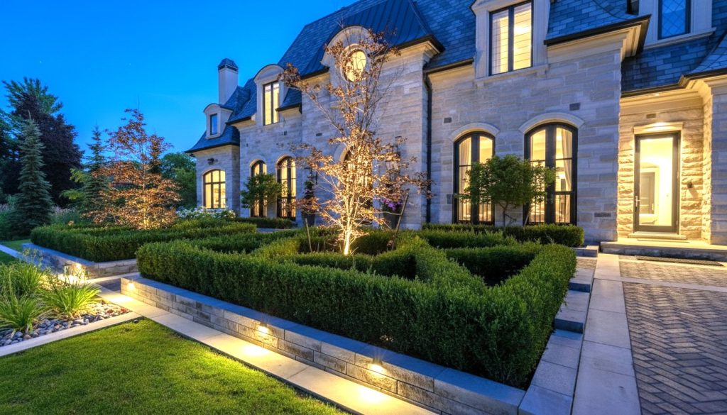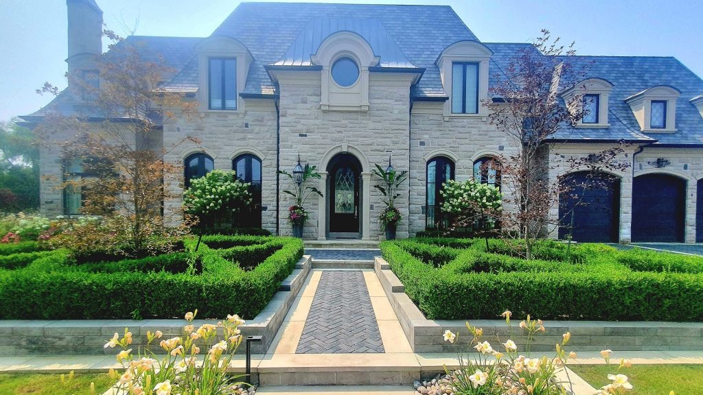 Boxwood hedging materials create classic geometric pattern. It is the ideal landscape complement for colonial, Italian and French inspired architecture.