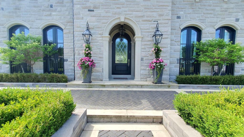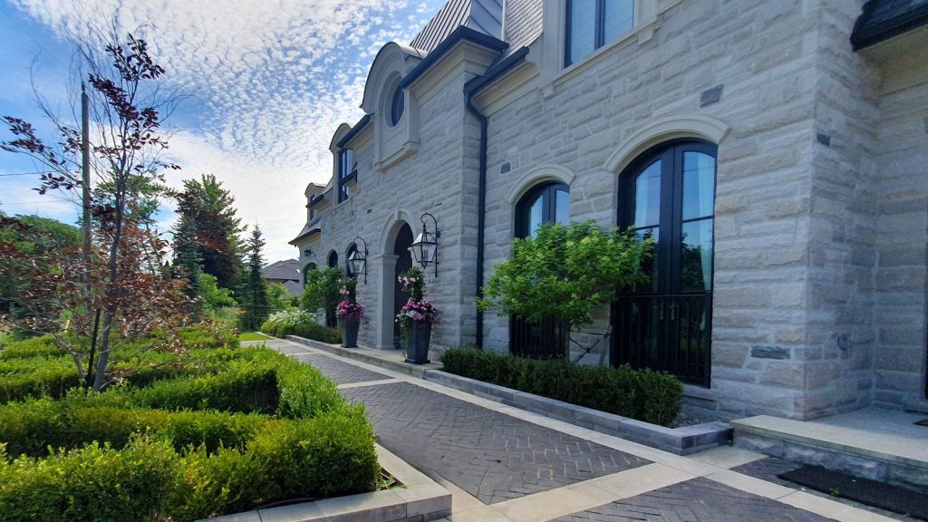 The cobblestone brick pavers and its pattern creates dramatic effect on the house’s curb appeal, complementing the style and pallet of the structure.
