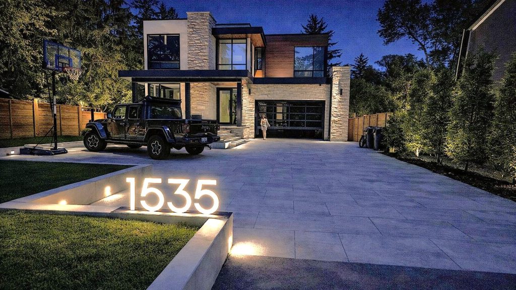 The sleek, modern architecture is reflected in the shape of the pool and surrounding patio. Sunken firepit seating area. Opened squire overhead structure represents a focal point of the design and frames the view of beautiful garden behind..
