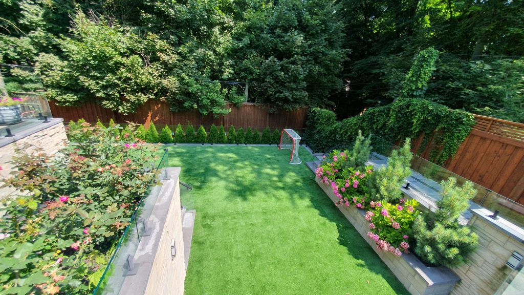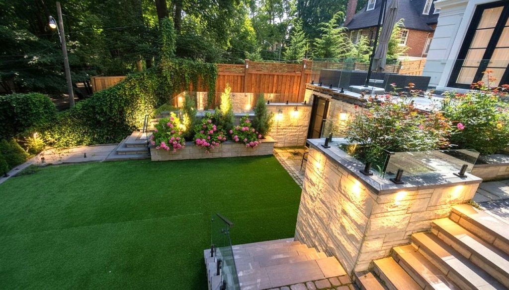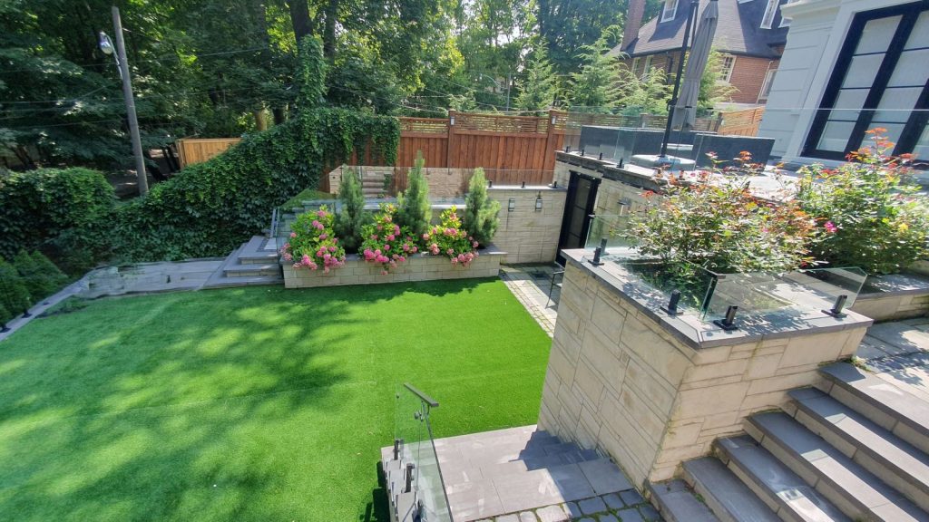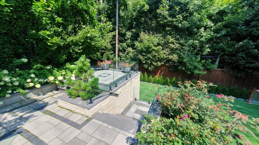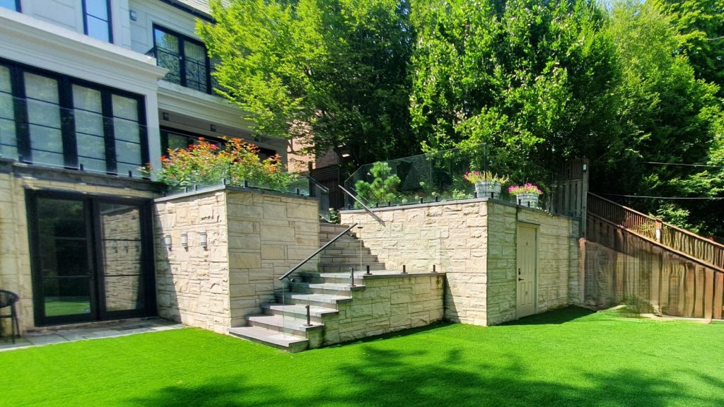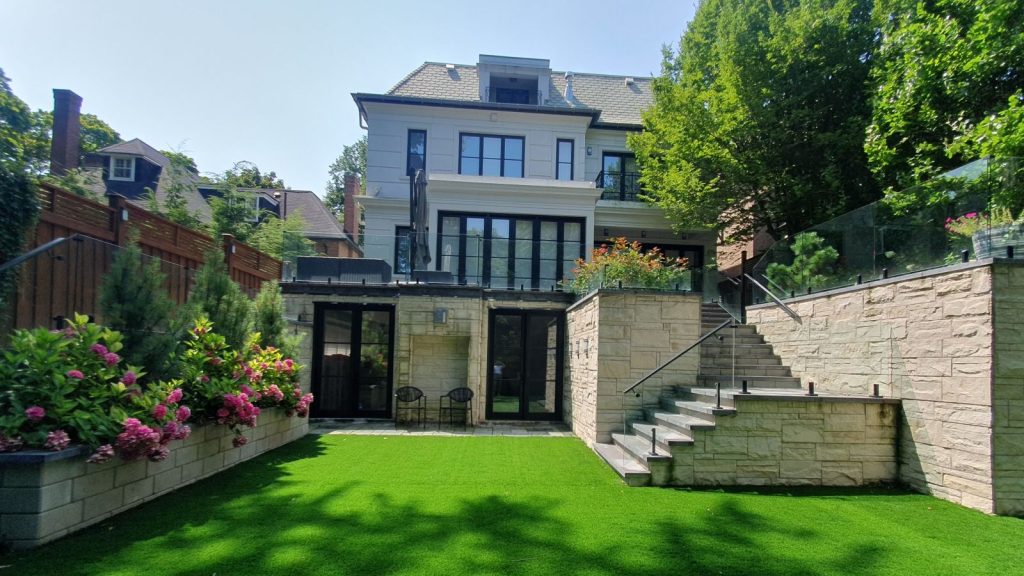 Unique basement walkout in Forest Hill Toronto, framed by stone retaining walls, layered terraces, and terraced gardens. Designing this steep backyard required careful planning to turn challenging grade into usable space. Stone retaining walls and terraces reshaped the slope, creating stable levels and a generous grass area. Opening the basement walkout transformed the lower level into a functional, light-filled extension of the garden.